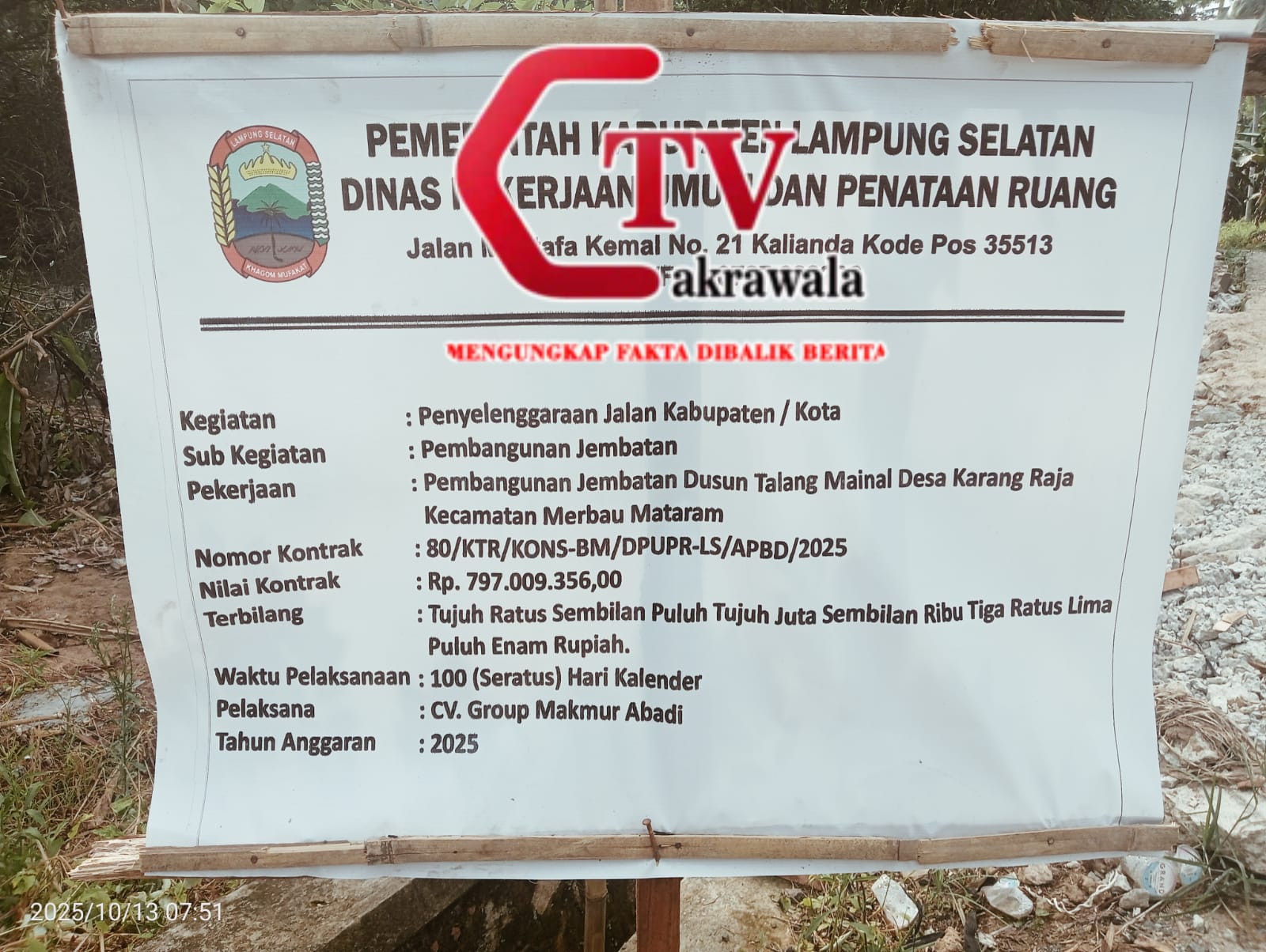 Lampung Selatan, www.Cakrawalatv.com- Proyek pembangunan Jembatan Talang Meinal yang berlokasi di Desa Karang Raja, Kecamatan Merbau Mataram, kini menjadi sorotan masyarakat. Pasalnya, proyek tersebut diduga dikerjakan secara asal-asalan dan tidak…