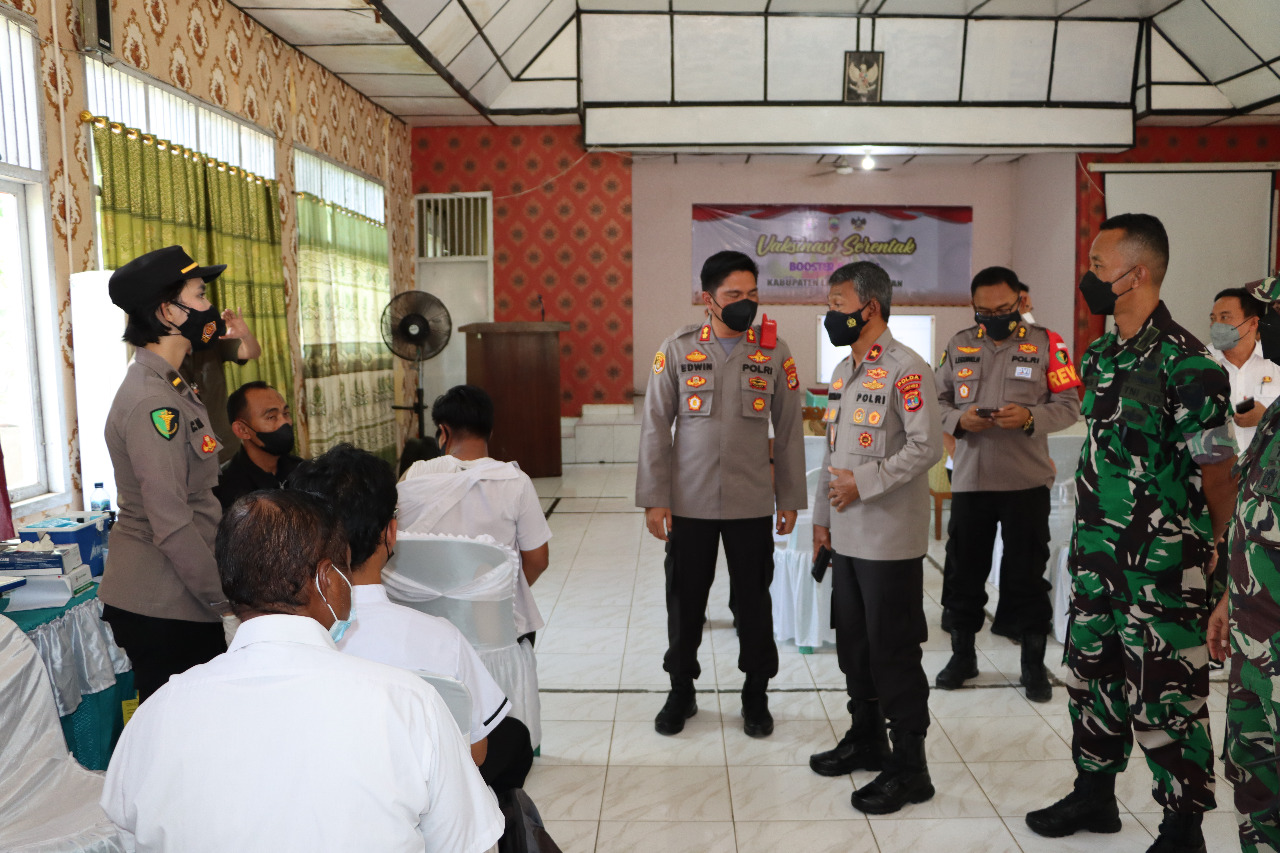 Peninjauan pelaksanaan Vaksinasi serentak yang dipusatkan di Aula Dinas Pendidikan Lampung Selatan, disambut oleh Kapolres Lamsel AKBP Edwin, SIK, SH, MSi dan para PJU serta Forkopimda Lampung Selatan.