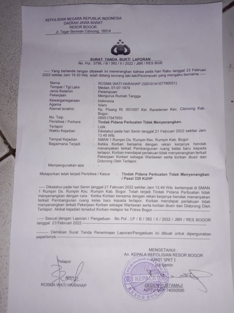 “Saat itu kami habis melakukan liputan kegiatan Rapat Minggon Kecamatan Rumpin, kami melihat ada pembangunan RKB di SMAN 1 Rumpin yang berdekatan dengan gedung kantor Kecamatan, kami mencoba untuk melakukan konfirmasi terkait pembangunan RKB tersebut namun yang saya dapatkan prilaku yang tidak menyenangkan dari Wakasek SMAN 1 Rumpin yang bernama Dhirja saya diusir sambil didorong keluar untungnya saya ditahan sama teman yang pada saat melakukan liputan bersama saya (Hari) kalau tidak saya bisa jatuh bahkan kepala saya bisa terbentur kedinding,” ungkap Rossa.