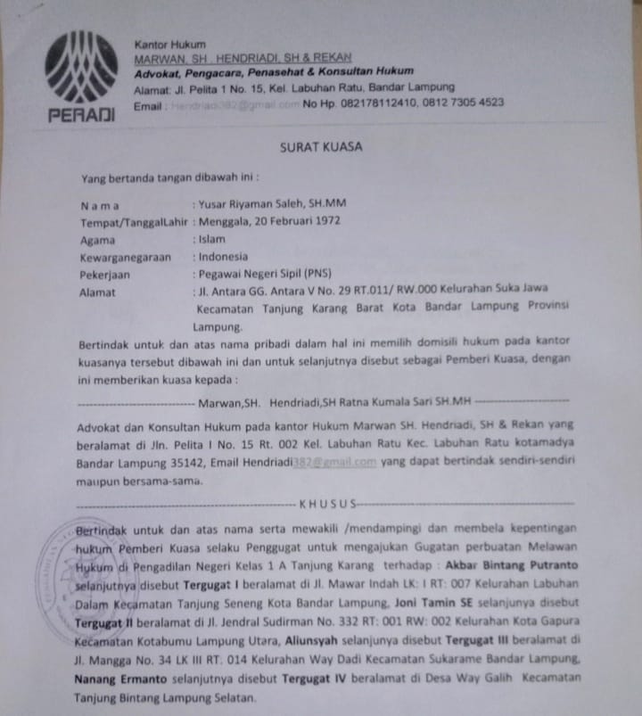 Menurut Hendriadi, SH, pihaknya selaku kuasa hukum Yusar Riyaman Saleh (penggugat) telah mendatangi kantor Pengadilan Negeri (PN) Tanjungkarang untuk mengikuti sidang kedua yang diajdualkan pada 23 Maret 2022.