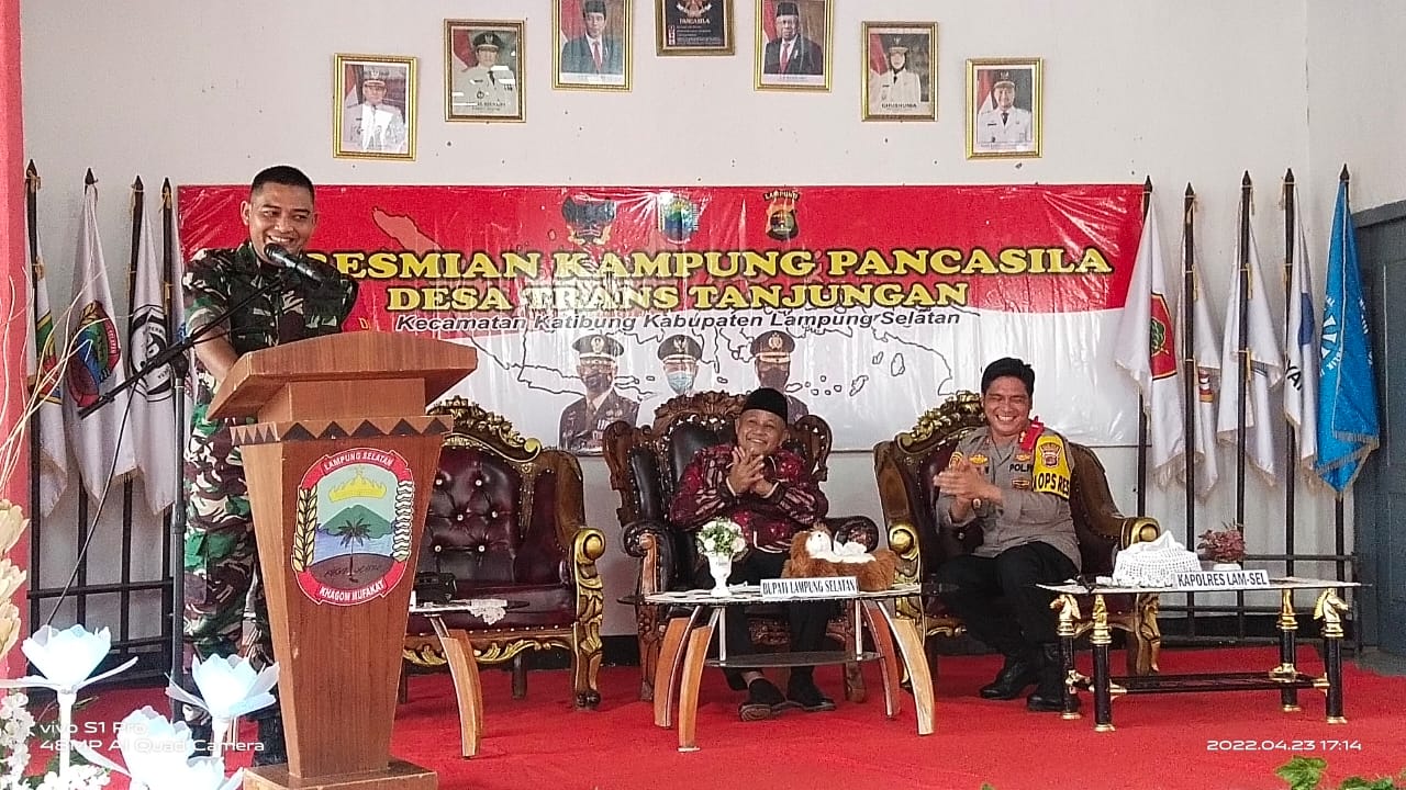 Lampung Selatan- Komandan Kodim 0421/Lamsel Letkol Inf.Fajar Akhirudin,S.IP. M.Si bersama Bupati Lampung Selatan H. Nanang Ermanto didampingi Kapolres Lamsel AKBP Edwin, SIK, SH, MSi, beserta Forkopimda lainnya meresmikan Kampung Pancasila di Desa Trans Tanjungan Kecamatan Katibung Kabupaten Lampung Selatan, Sabtu (23/04/2022).