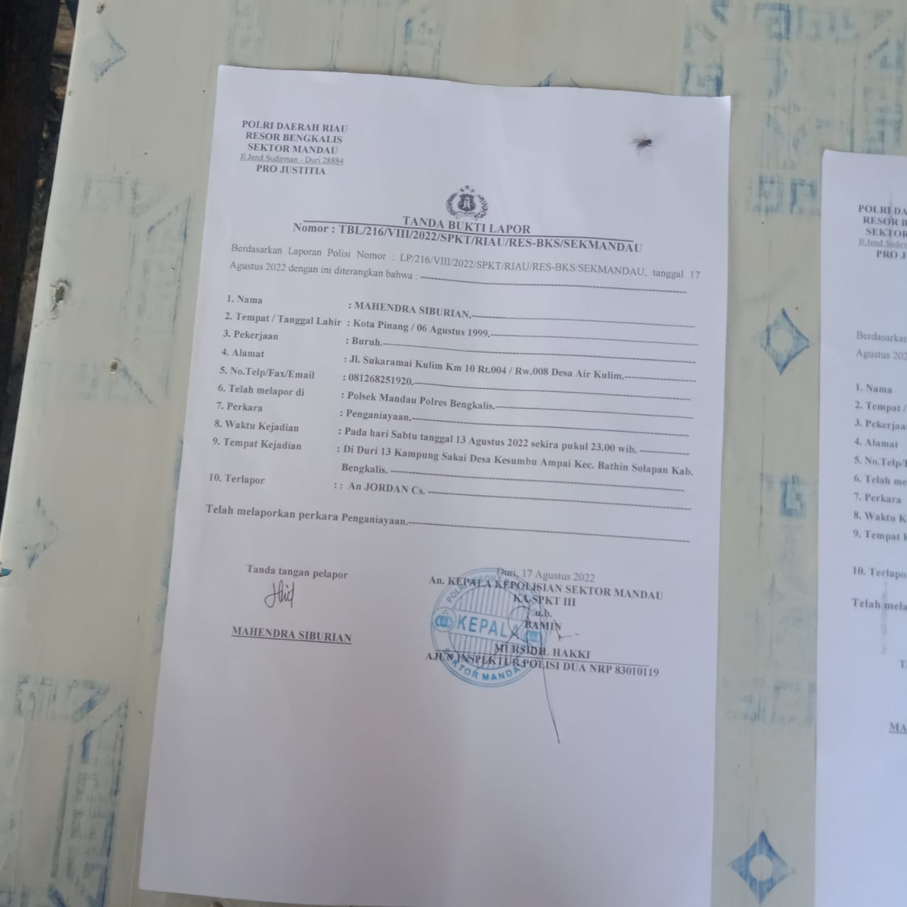 Dijelaskan korban, Dia lapor ke polsek Mandau dan ada juga bukti visum dari rumah sakit dan sudah di pegang oleh petugas polsek Mandau ” ujar nya.Karena itu lah kita berharap agar proses hukum berlanjut, dan pelaku memukul saya ada beberapa orang selain dari pada JD supaya dapat di proses sesuai hukum yang berlaku dan seadil – adilnya harap Mahendra.