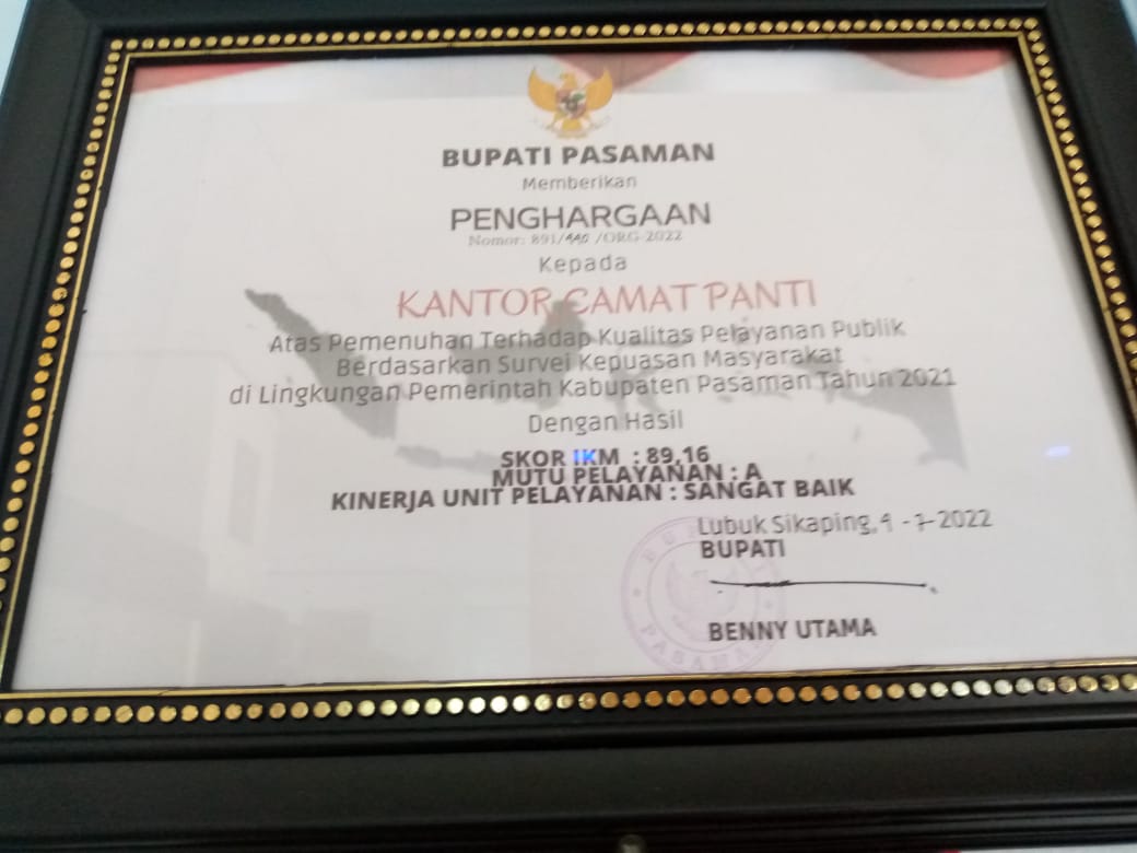 Bupati Pasaman H.Benny Utama Memberikan Piagam Penghargaan kepada Camat Panti Aswar dalam rangka penilaian kinerja camat panti atas pemenuhan terhadap kualitas pelayanan publik berdasarkan survei kepuasan masyarakat di lingkungan pemerintah kabupaten Pasaman pada tahun 2021 “Kata Bupati Pasaman Benny Utama.