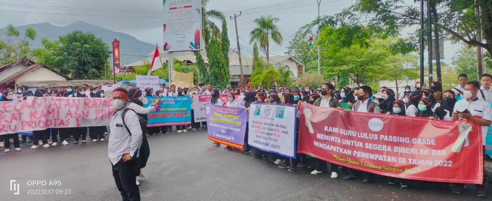 Dalam aksi unjuk rasa yang di koordinatori (Korwil) oleh guru honorer Lamsel, Fulkan Gaviri S.Pd dengan di ikuti ratusan pesrta dewan guru honor yang lulus Passing Grade 2021. Kurang lebih 400 san orang, didampingi oleh ormas Garuda DPD Lamsel.