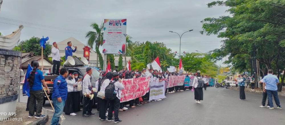Massa yang berjumlah sekitar 400 orang itu melakukan aksi damai terkait minimnya formasi yang dibuka pada rekrutmen PPPK guru 2022 yakni hanya berjumlah 70 formasi.