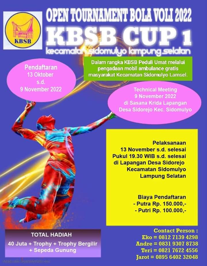 Lampung Selatan,– Open tournanent Voly Ball KBSB CUP I yang di laksanakan di Lapangan Desa Sidorejo Kecamatan Sidomulyo Kabupaten Lampung Selatan memperebutkan Total Hadiah Rp. 40.000.000, Trophy dan Throphy bergilir dan juga disediakan Door prize 1 unit Sepeda Gunung dari pengundian karcis masuk bagi pecinta dan penonton. Minggu malam,(21/11/2022).