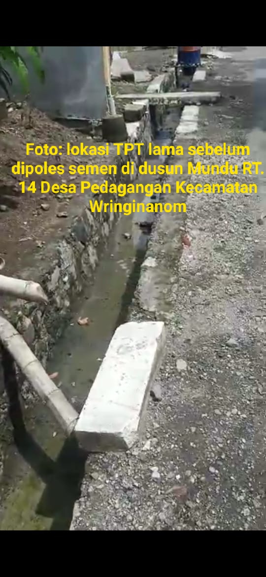 Pasalnya, drainase tersebut sangat jelas terlihat kalau sistemnya teknis nya Asal asalan, Dimana proses pekerjaannya hanya memoles dengan semen saja, di karenakan sebelumnya memang ada saluran TPT yang lama tanpa penggalian untuk memasang pondasi.