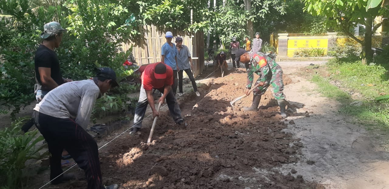 Bintara Pembina Desa (Babinsa) Koramil 421-05/Pdc, Kodim 0421/Ls Sertu Maradona, bersama masyarakat gotong royong membuat saluran air (parit) di Desa Sidodadi Kecamatan Teluk Pandan Kabupaten Pesawaran, Selasa (28/03/2023).