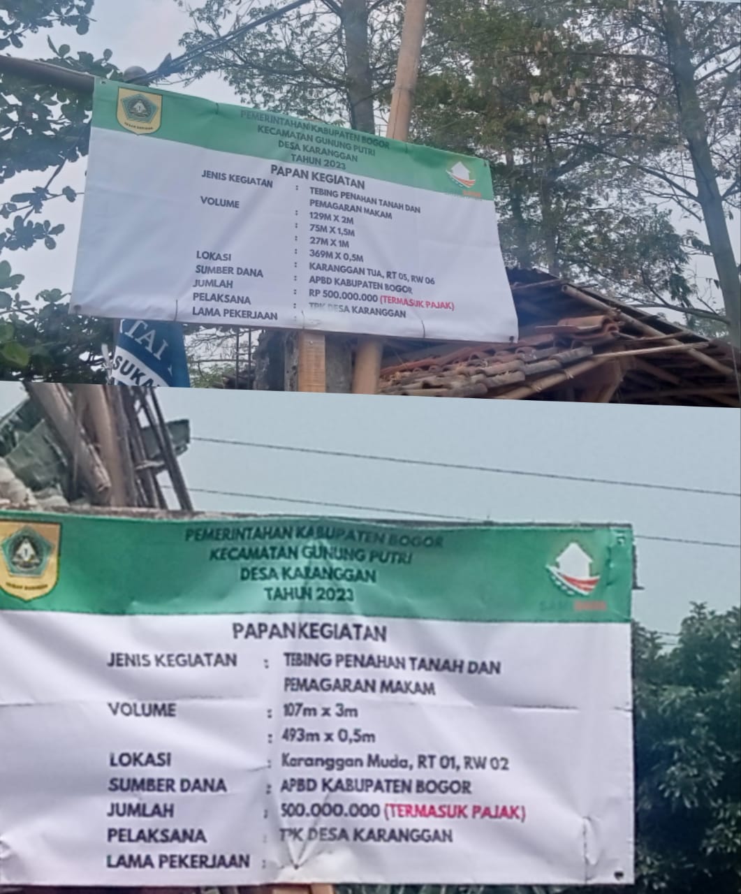 Pembangunan tersebut berlokasi di 2 lokas gang mencos dan gang cakung karanggan muda RT 001 RW 002 dengan volume 107 x 3m , 495.mx 0,5,m dengan fisik Tebing penahan tanah dan pemaggaran makam bersumber dari dana APBD Kabupaten dengan jumlah anggaran Rp.500.000.000 karanggan tua RT 05 RW 06 dengan volume 129.mx 2. 75.mx 1,5.m 27.mx 1.m 369.mx 0,5.m dengan jumlah anggaran 500.000.000 samisade tahap ke satu, untuk pengerjaanya melalui Tim Pelaksana Kegiatan (TPK) dengan sistem swakelola.