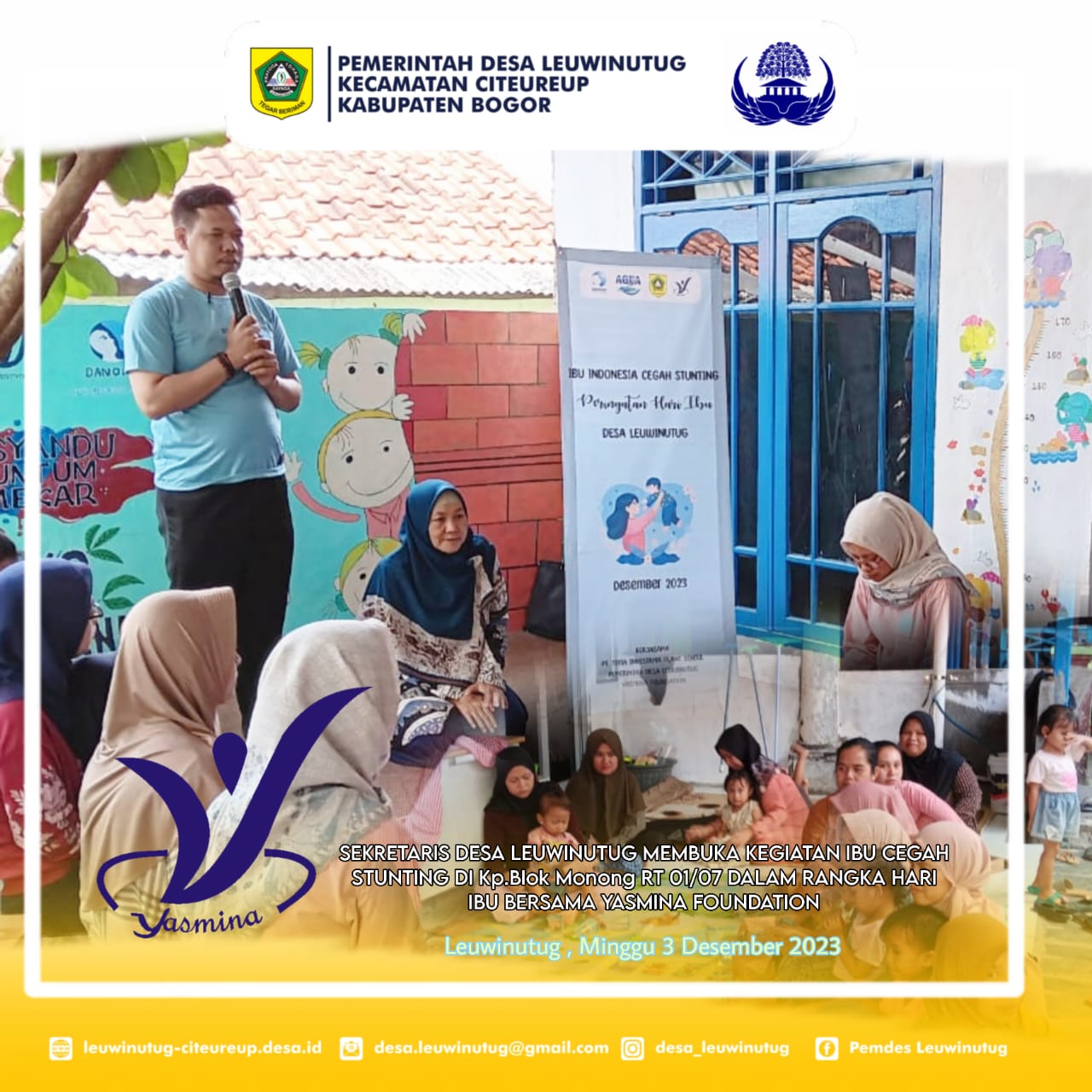 Dalam rangka hari Ibu Pemerintahan Desa Leuwinutug,Kecamatan Citeureup,Kabupaten Bogor yang di pimpin langsung oleh Kepala Desa Leuwinutug Bapak Deden Saepul Hamdi,S.Ip bersama YASMINA Foundation bagian CSR PT Tirta Investama Plant Sentul, mengadakan kegiatan “Ibu Indonesia cegah Stunting” di kp Blok Monong RT 01 RW 07 Desa Leuwinutug kecamatan Citeureup kabupaten Bogor.