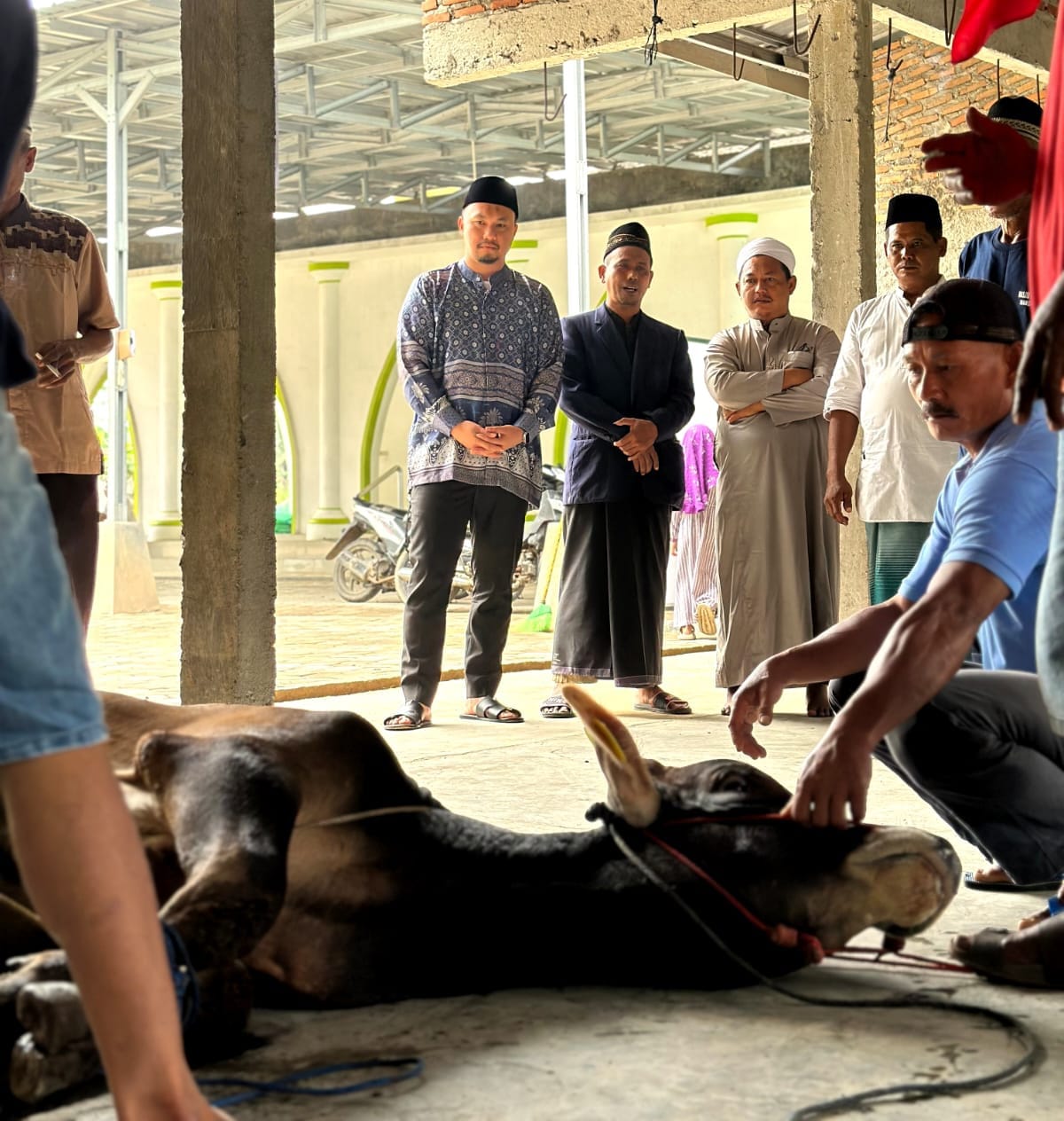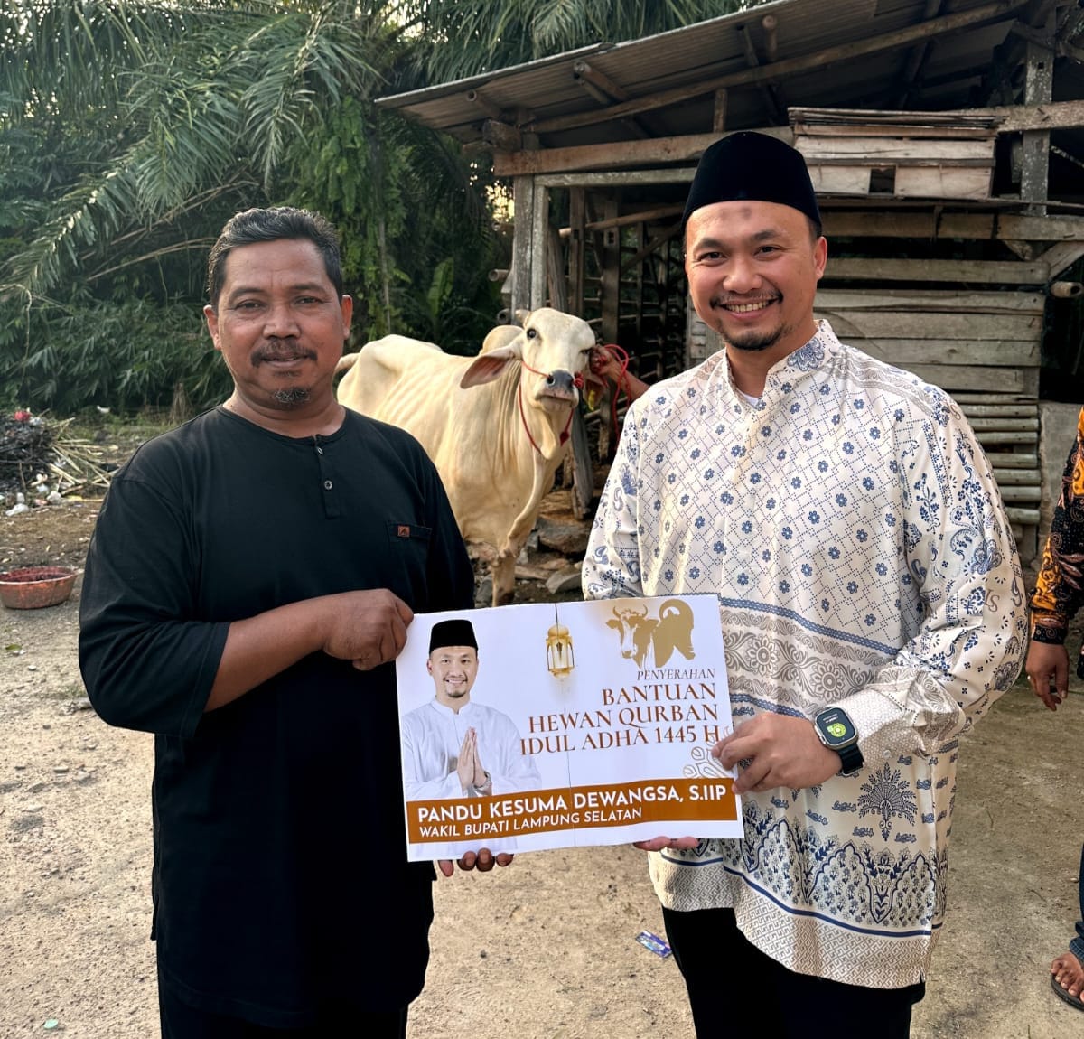 LAMPUNG SELATAN — Momentum hari raya Idhul Adha 1445 Hijriyah, Wakil Bupati Lampung Selatan Pandu Kesuma Dewangsa (PKD) rutin berqurban di daerah di Kabupaten Lamsel.