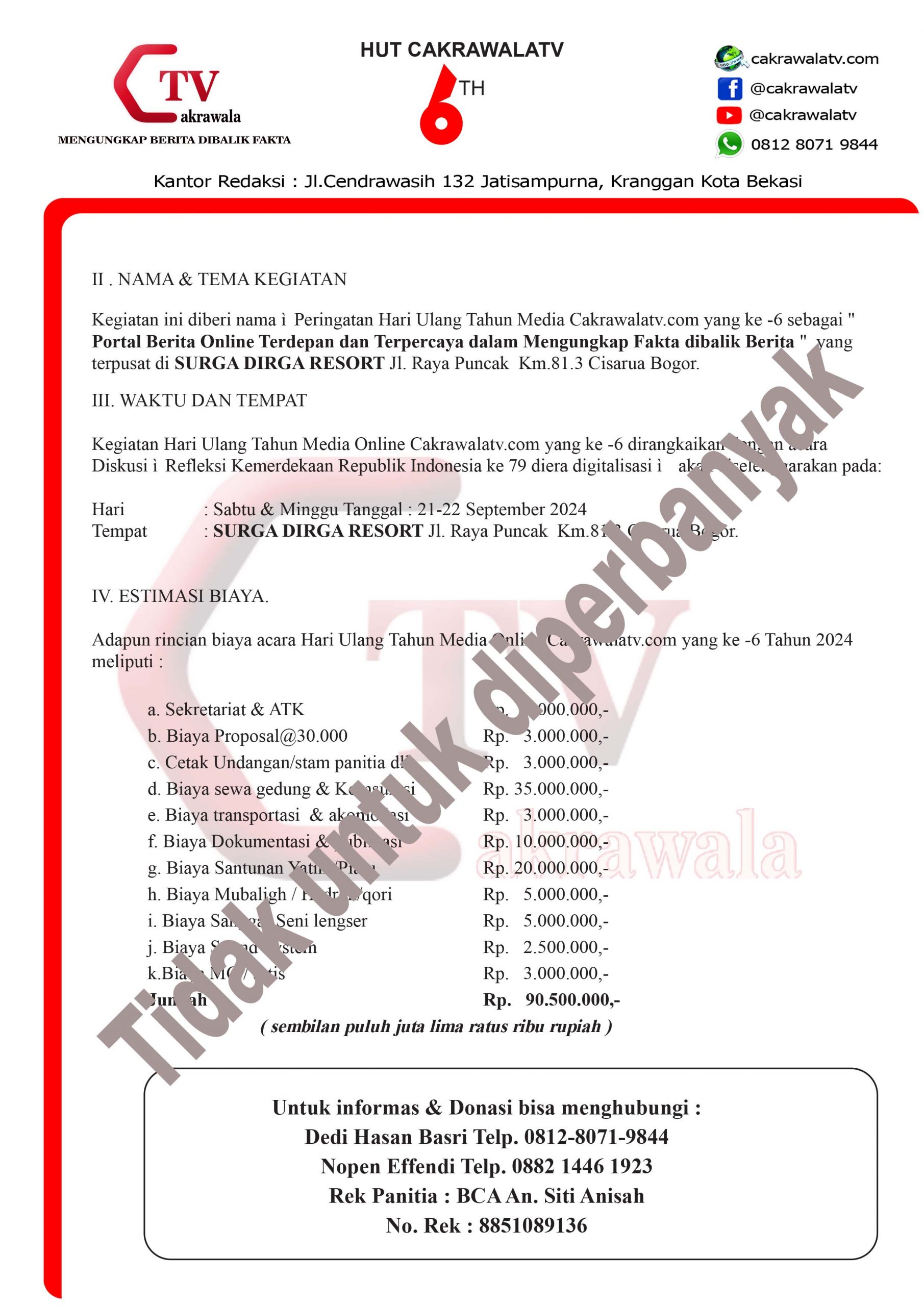 Kegiatan ini diberi nama “ Peringatan Hari Ulang Tahun Media Cakrawalatv.com yang ke -6 sebagai ” Portal Berita Online Terdepan dan Terpercaya dalam Mengungkap Fakta dibalik Berita ” yang terpusat di SURGA DIRGA RESORT Jl. Raya Puncak Km.81.3 Cisarua Bogor.