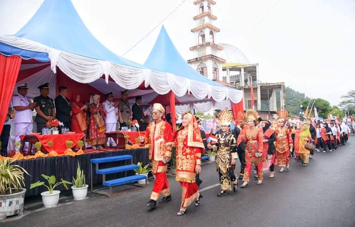 CakrawalaTvNews ,Tapteng (Sumut) – PANDAN–Setelah Rapat Paripurna Istimewa DPRD Kabupaten Tapanuli Tengah (Tapteng) dalam rangka Memperingati Hari Jadi Kabupaten Tapteng Ke-79 Tahun 2024, Pj Bupati Tapteng Dr. Sugeng Riyanta, SH, MH, beserta Pj Ketua Tim Penggerak (TP) PKK Kabupaten Tapteng Ny. Ade Sugeng Riyanta Pimpinan dan Anggota DPRD Kabupaten Tapteng, Forkopimda Tapteng, rombongan para undangan tamu lainnya menuju Jl. Dr. Ferdinand Lumban Tobing Kecamatan Pandan, untuk melepas Karnaval Defile Silua Kontingen 20 Kecamatan se-Kabupaten Tapteng dan Organisasi Perangkat Daerah (OPD) Lingkungan Pemkab Tapteng, pada hari Sabtu (24/08/2024).