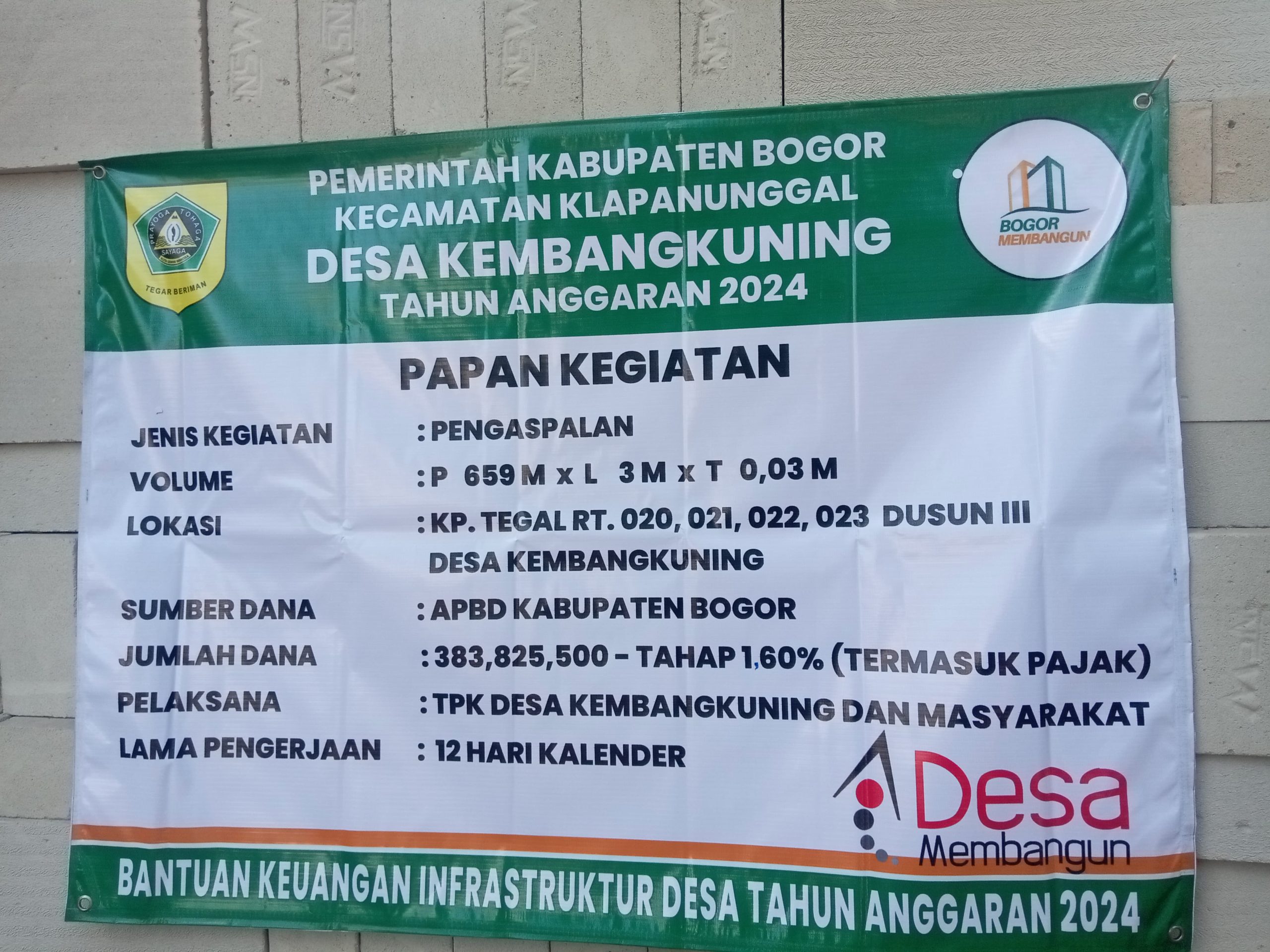 Neneng Robinah kepala desa kembang kuning menyampaikan, Pengerjaan Tahap 1 pengaspalan Jalan Desa di Kp.tegal RT 020,021,022,023 dengan memakai anggaran Rp. 383,825,500 Dengan volume p.659 m x L 3 x T 0,03 m