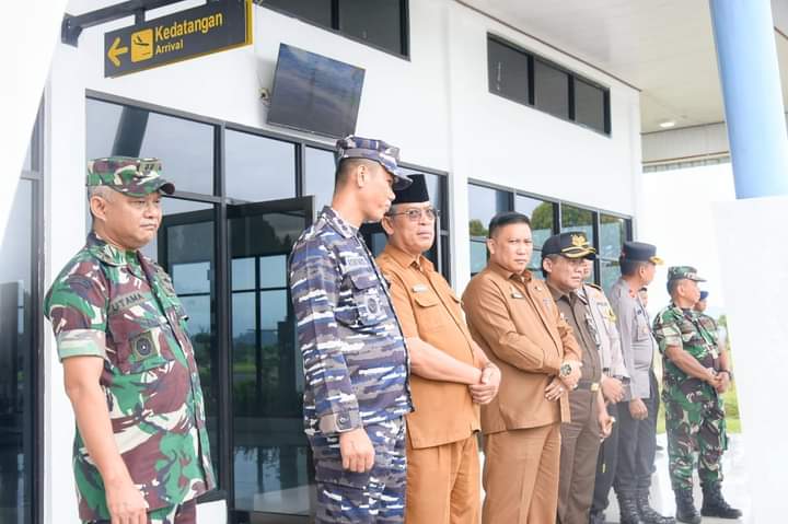 Dr. Erwin Hotmansah Harahap, S.STP, MM, bersama dengan Forkopimda Tapanuli Tengah, menyambut kedatangan Panglima Koops Udara Nasional Marsdya TNI Ir. Tedi Rizalihadi S., M.M., beserta rombongan di Bandar Udara