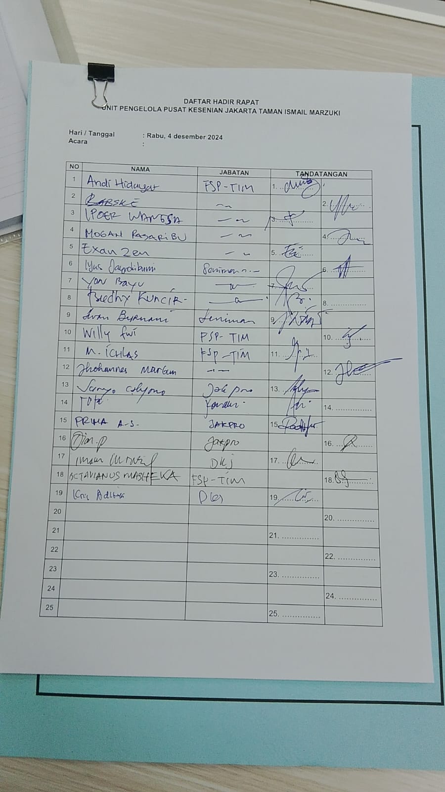 Cakrawalatv.com. Jakarta, Rabu, 4 Desember 2024. Bertempat diruang rapat UPT-PKJ TIM, Lantai 3 gedung Teater Jakarta, Taman Ismail Marzuki, Cikini 73. Forum Seniman Peduli Taman Ismail Marzuki (FSP TIM) secara bersama-sama mendatangi pihak UPT-PKJ TIM untuk membahas perihal keberadaan posko saveTIM. Pertemuan tersebut sudah dipersiapkan sebelumnya dengan surat audiensi yang dilayangkan dari perwakilan FSP TIM kepada pihak UPT PKJ TIM.