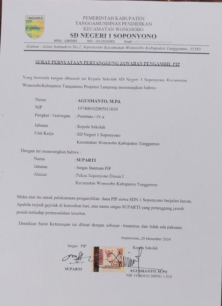 “Terkait potongan tersebut saya tidak bertanggung jawab bahkan sebelum Siswa mengambil dana PIP saya sudah dapat bocoran dari wali siswa, mau ada pungutan oleh satgas PIP. Sebesar Lima puluh ribu rupiah (Rp 50.000) Langsung saya panggil. SUPARTI. selaku Kordennya. Sudah saya tegor, bahkan saya buatin surat pernyataan pertanggung jawaban apa bila ada masalah di kemudian hari terkait potongan dana PIP. Saya tidak mau terlibat, hingga di tanda tangan langsung oleh Suparti bahkan surat pernyataan tersebut bermaterai,” Ungkap Kepala Sekolah Soponyono