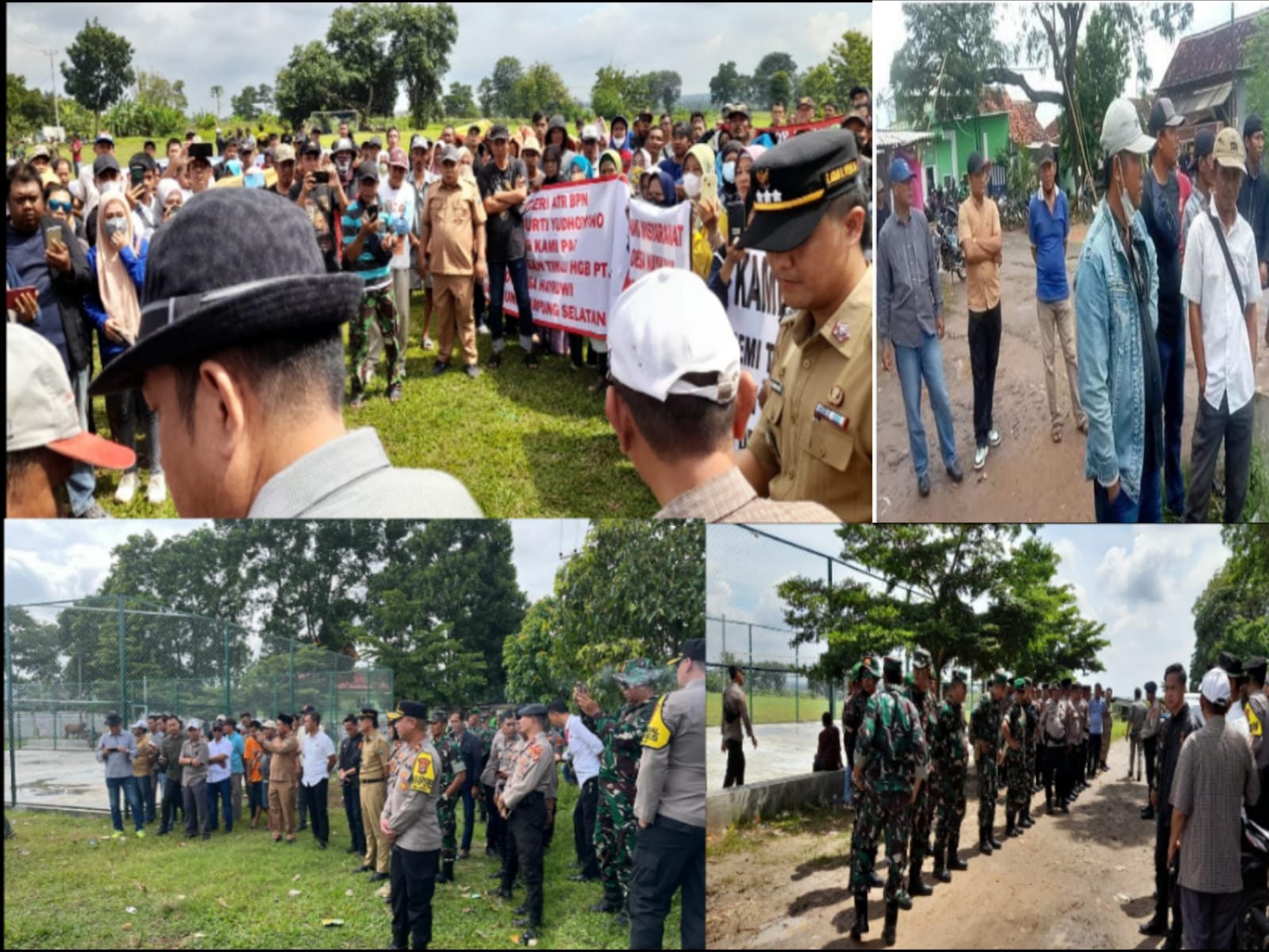 Warga dan Aparatur Desa Way Huwi Kecamatan Jatiagung Kabupaten Lampung Selatan, saat meminta kepada PT BTS agar tidak melakukan pemagaran lapangan sepertinya tak di gubris, sementara TNI Polri Nampak berjaga-jaga, Februari 2024 (poto. Dok pemdes Way Huwi.