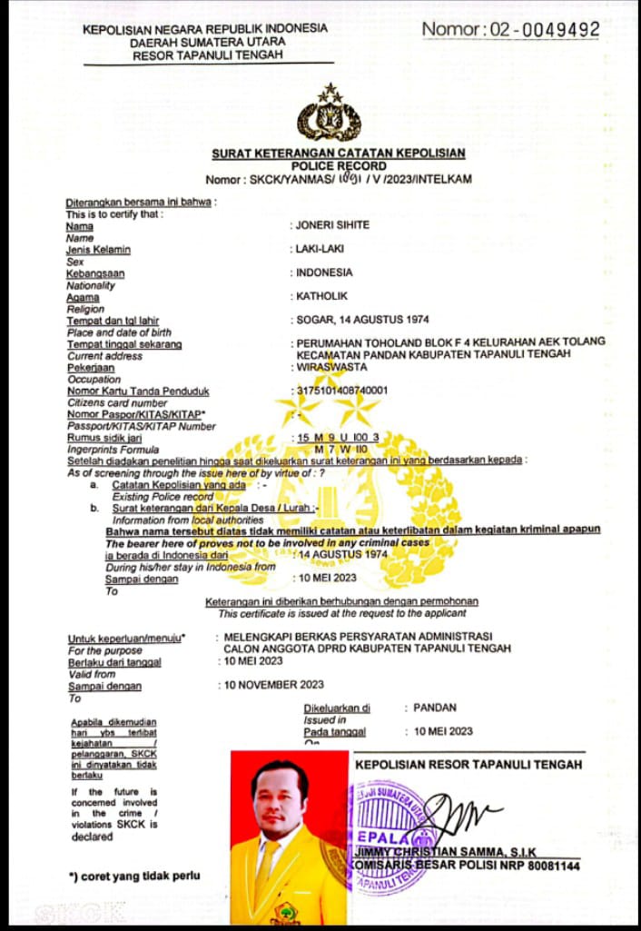 “Hal itu untuk keperluan melengkapi berkas persyaratan administrasi calon anggota DPRD Tapteng yang ditandatangani Kapolres AKBP Jimmy Chirstian Samma tertanggal 10 Mei 2023, sehingga surat keterangan tidak pernah sebagai terpidana dikeluarkan PN Sibolga yang ditandatangani Ketua PN Sibolga Lenny Lasminar tertanggal 11 Mei 2023,” katanya.