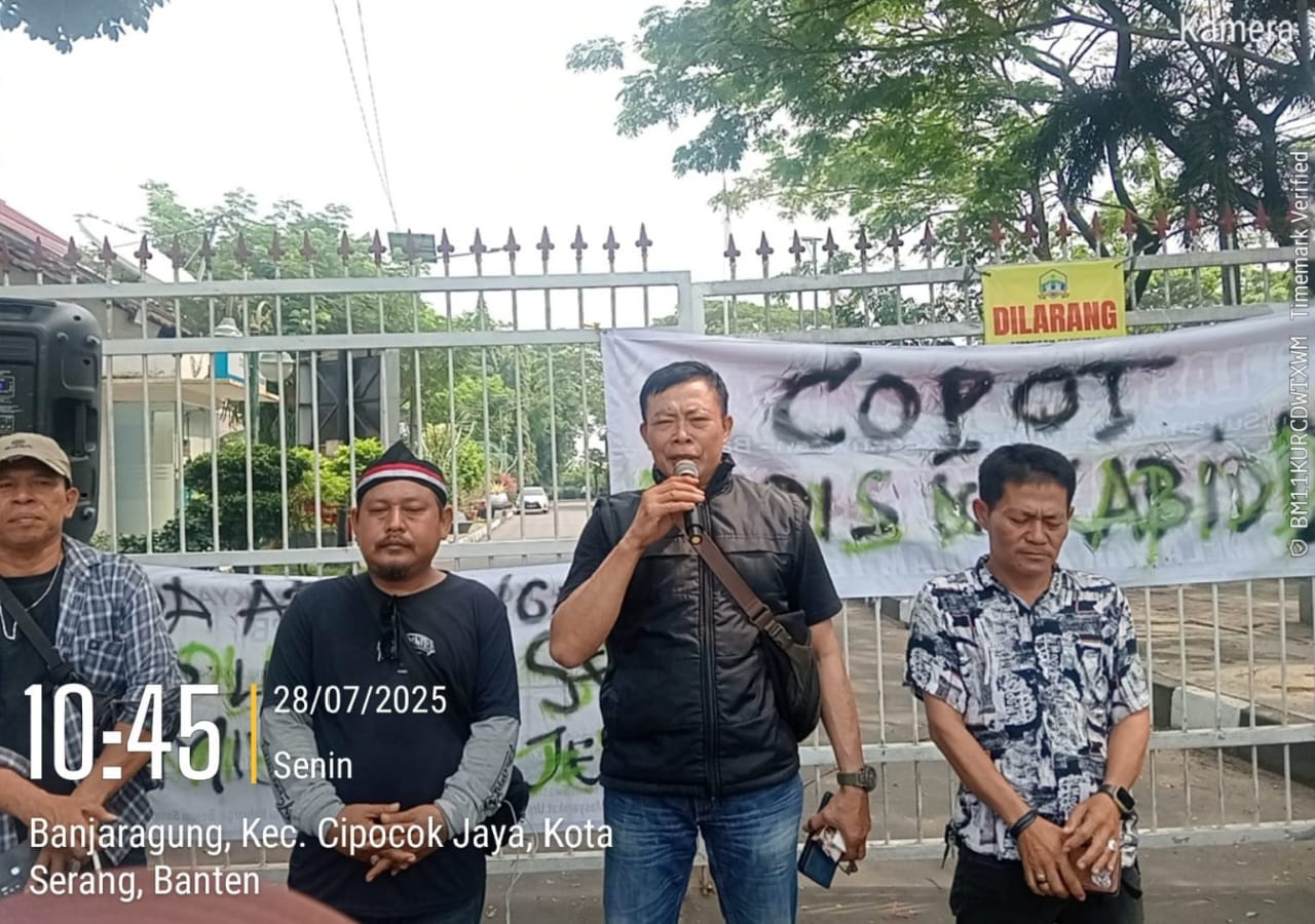 SERANG | Cakrawatv.news— Koalisi Barisan Depan Anti Koruptor Bersatu (Badak Bersatu) kembali menggelar aksi unjuk rasa di depan gerbang Pemerintah Kota Serang dan Kantor Dinas Lingkungan Hidup (DLH), Senin (28/7/2025). Aksi tersebut merupakan bentuk desakan publik terhadap dugaan korupsi dan ketidakterbukaan anggaran di lingkungan DLH, yang disebut merugikan keuangan negara hingga Rp.2,1 miliar.