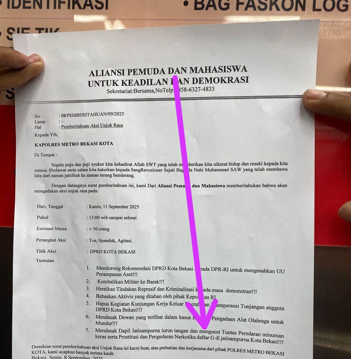 Dalam surat pemberitahuan yang ditujukan kepada Kapolres Metro Bekasi Kota, massa aksi menyampaikan sejumlah tuntutan, di antaranya: