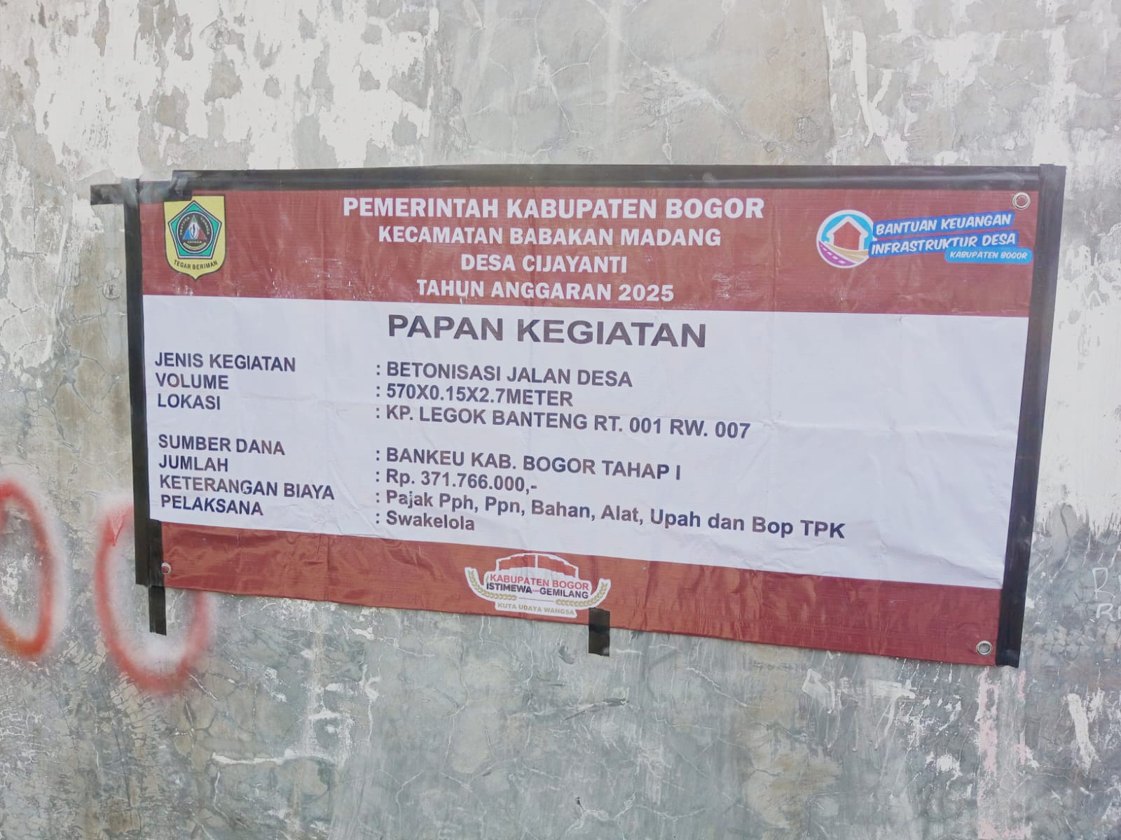 Adapun lokasi pembangunan berada di Kampung Legok Banter, RT 001 RW 007, dengan volume pekerjaan sepanjang 570 meter, lebar 2,7 meter, dan ketebalan 0,15 meter. Total anggaran yang dialokasikan sebesar Rp 371.766.000,- mencakup berbagai komponen biaya, antara lain pajak PPh, PPN, bahan material, peralatan, upah pekerja, serta biaya operasional TPK.