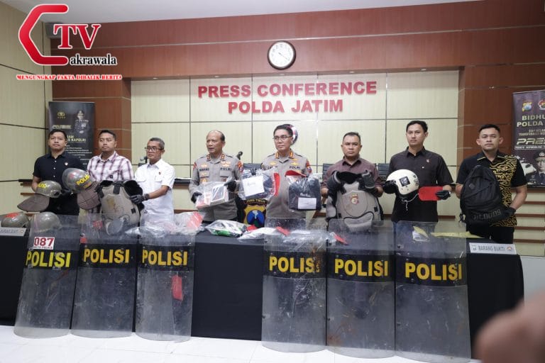 -Polda Jawa Timur merilis perkembangan penanganan kasus perusakan, penjarahan, dan pembakaran fasilitas umum yang terjadi dalam rangkaian aksi anarkis di sejumlah wilayah Jatim, Kamis (18/9/2025) di Gedung Press Conference Bidhumas Polda Jatim.