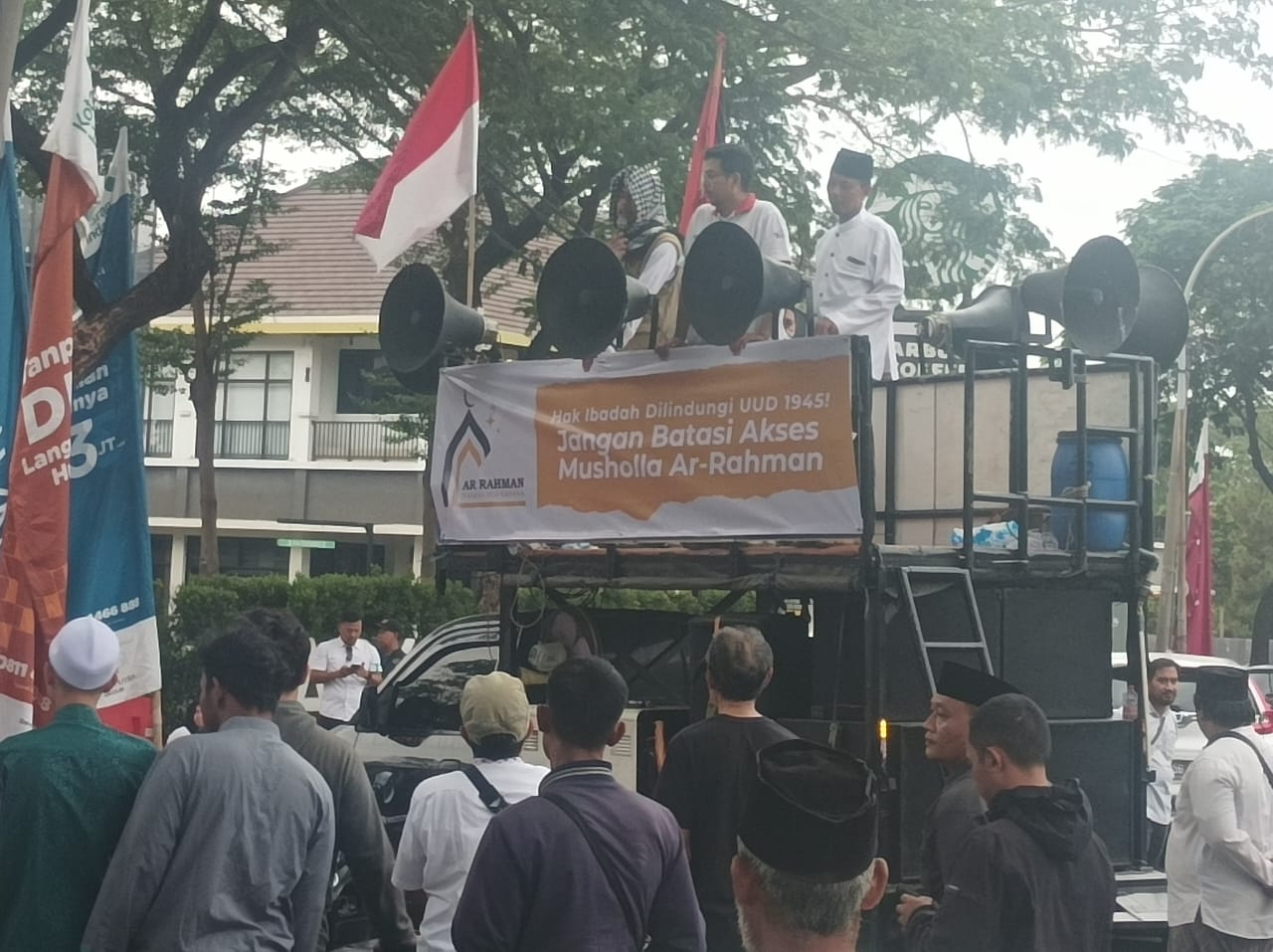 Bekasi – Ratusan massa yang mendukung warga Cluster Neo Vasana, menggelar aksi damai menuntut pembukaan akses menuju Mushola Ar-Rahman, yang telah dibangun oleh warga setempat.