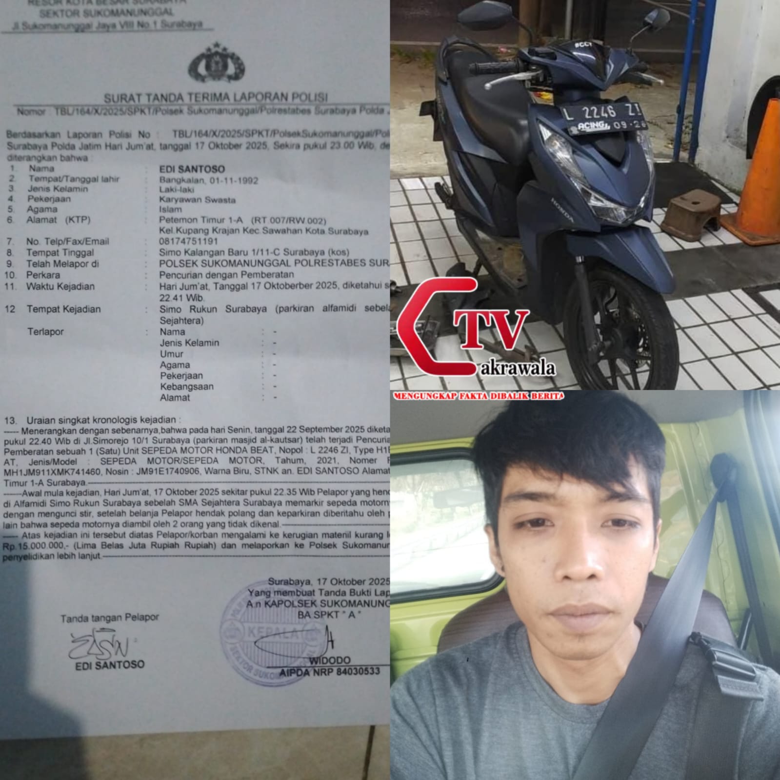 Surabaya, Cakrawala Tv-Telah terjadi kehilangan motor di sekitar jalan Simo Sukomanunggal Surabaya korban sudah melaporkan ke Polsek Sukomanunggal, kronoligis kejadiannya saat di parkiran Alfamidi pada saat parkir tukang pada saat masuk tukang parkirnya ada setelah orangnya keluar Motornya hilang parkirnya tidak ada oleh karena itu kami minta pertanggun jawaban.
