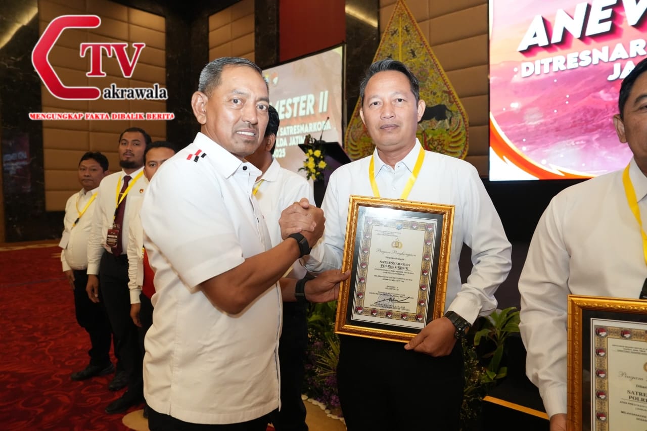 Penghargaan tersebut diserahkan langsung oleh Direktur Reserse Narkoba Polda Jawa Timur, Kombes Pol. Robert Da Costa, S,I,K., M,H., kepada Kasat Narkoba Polres Gresik, AKP Ahmad Yani, S,H dalam kegiatan yang berlangsung pada Kamis hingga Jumat di Hotel The Singhasari Resort Batu, Kota Batu Jawa Timur.