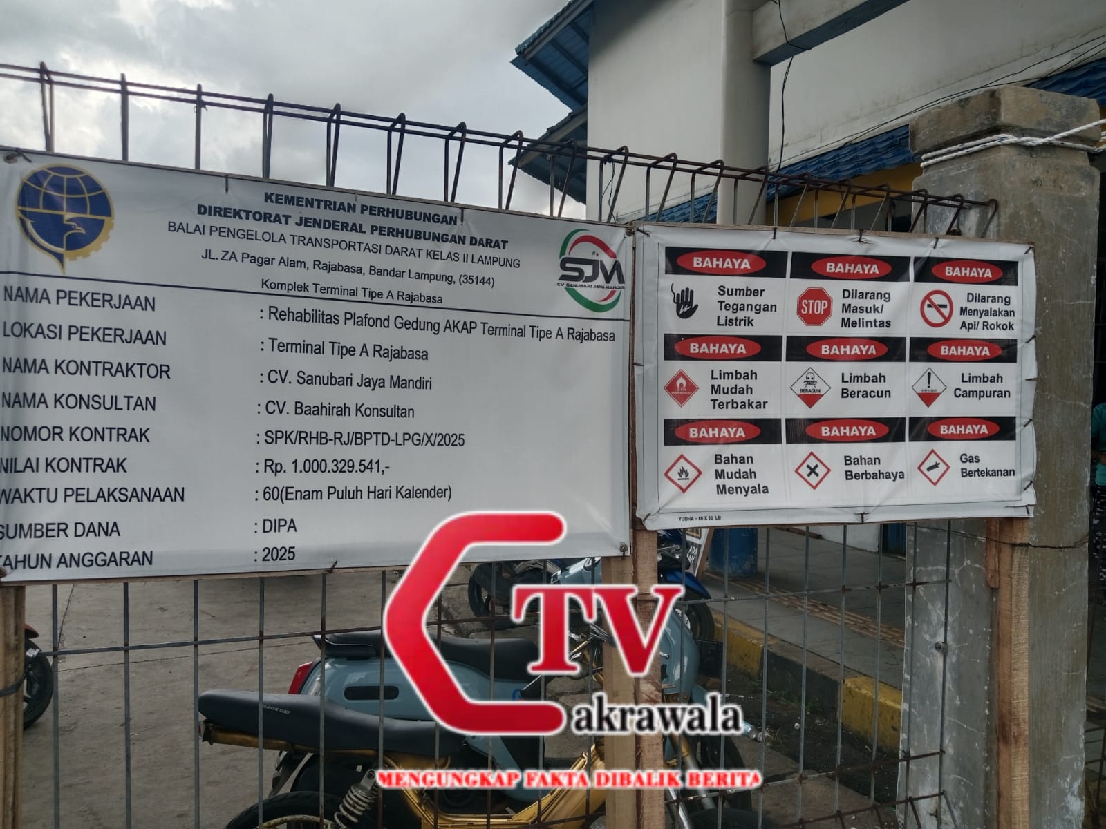 Pemandangan itu menjadi pintu masuk untuk menelusuri proyek Rehabilitasi Plafon Gedung AKAP Terminal Tipe A Rajabasa, proyek bernilai Rp1.000.329.541 yang dibiayai DIPA Tahun Anggaran 2025 dan berada di bawah Kementerian Perhubungan RI, Direktorat Jenderal Perhubungan Darat, melalui Balai Pengelola Transportasi Darat (BPTD) Kelas II Lampung.