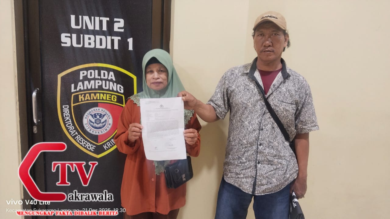 ibu sakinah melaporkan ke polda lampung di dampingi oleh suami bapak arifin, tekad bulet untuk menuntut keadilan degan membuat Laporan resmi ke Polda Lampung pada Hari Minggu 21 Desember 2025 ,dan di dampingi oleh kuasa Hukum nya ,dan Alhmdulilah,Disana dilayani degan baik oleh Penyidik SPKT dan penyidik Di ruangan (Krimum)Polda Lampung