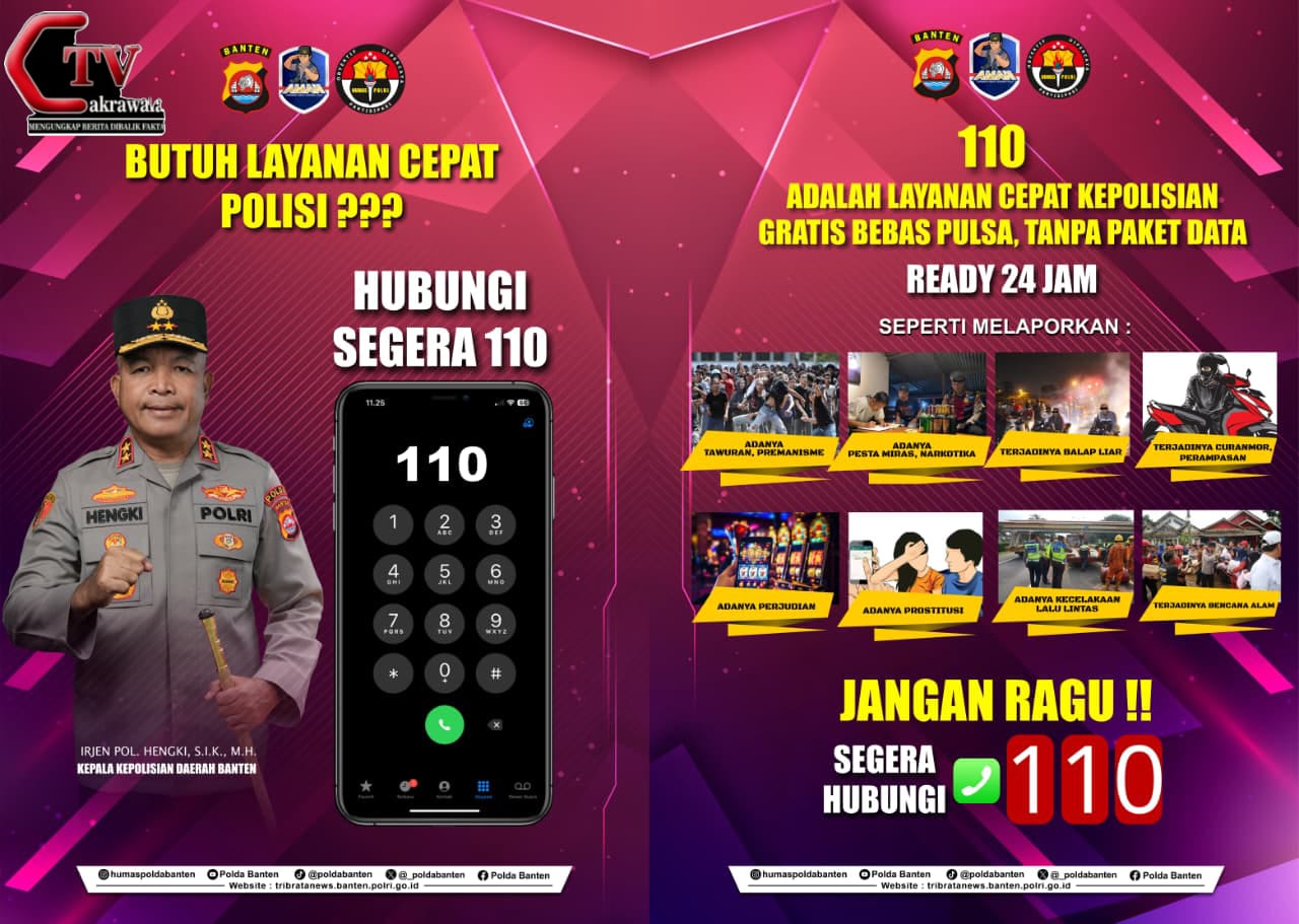 Serang, www.Cakrawalatv.com- Polda Banten terus memperkuat pelayanan kepada masyarakat dengan mengoptimalkan layanan Call Center 110 yang dapat diakses selama 24 jam secara gratis. Layanan ini menjadi sarana pelaporan cepat bagi masyarakat dalam menghadapi situasi darurat maupun gangguan keamanan dan ketertiban masyarakat (kamtibmas).